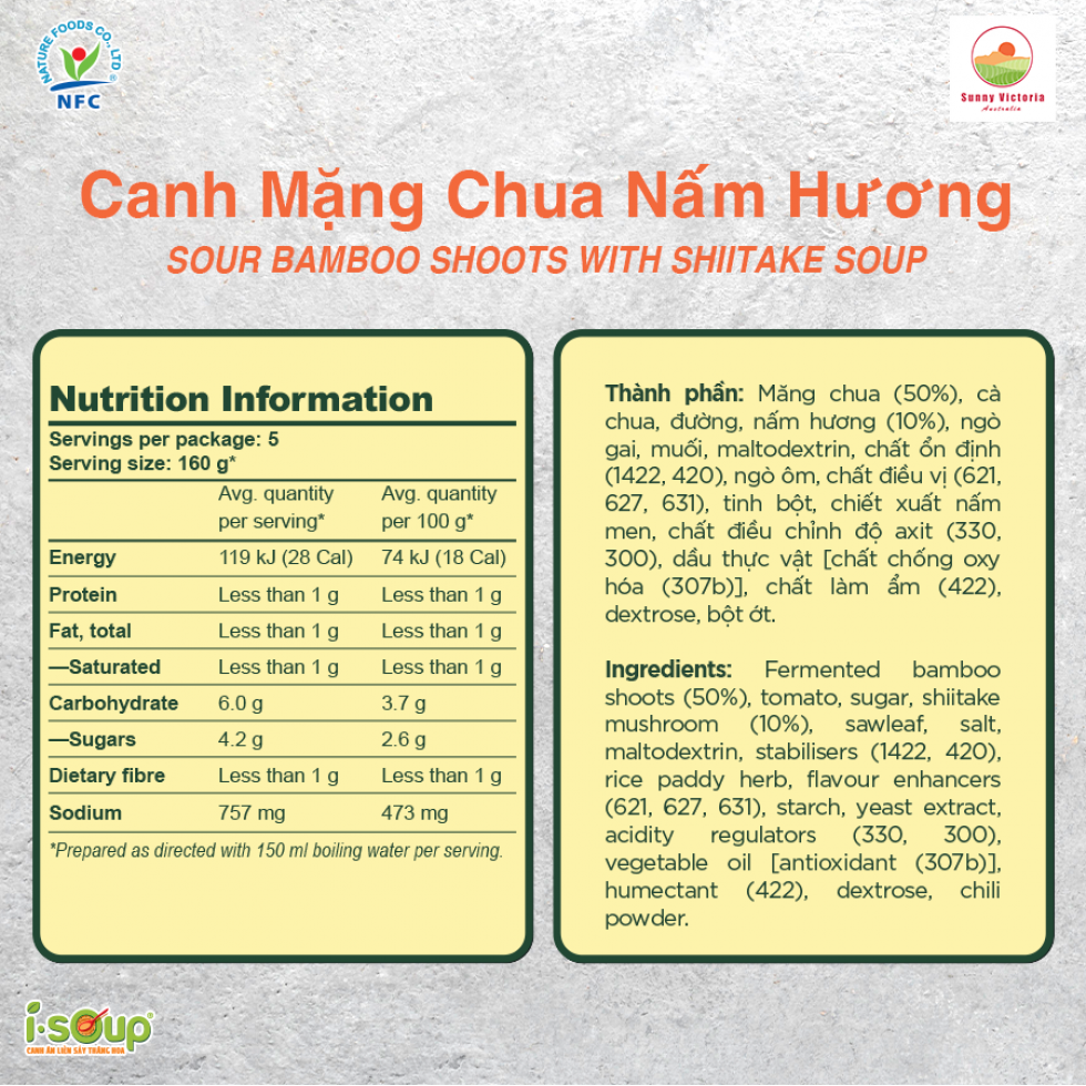 Thành phần: Măng chua (50%), cà chua, đường, nấm hương (10%), ngò gai, muối,maltodextrin, chất ổn định (1422, 420), ngò ôm, chất điều vị (621, 627, 631), tinh bột, chiết xuất nấm men, chất điều chỉnh độ axit (330, 300), dầu thực vật (dầu đậu nành, chất chống oxy hóa (307b)), chất làm ẩm (422), dextrose, bột ớt.